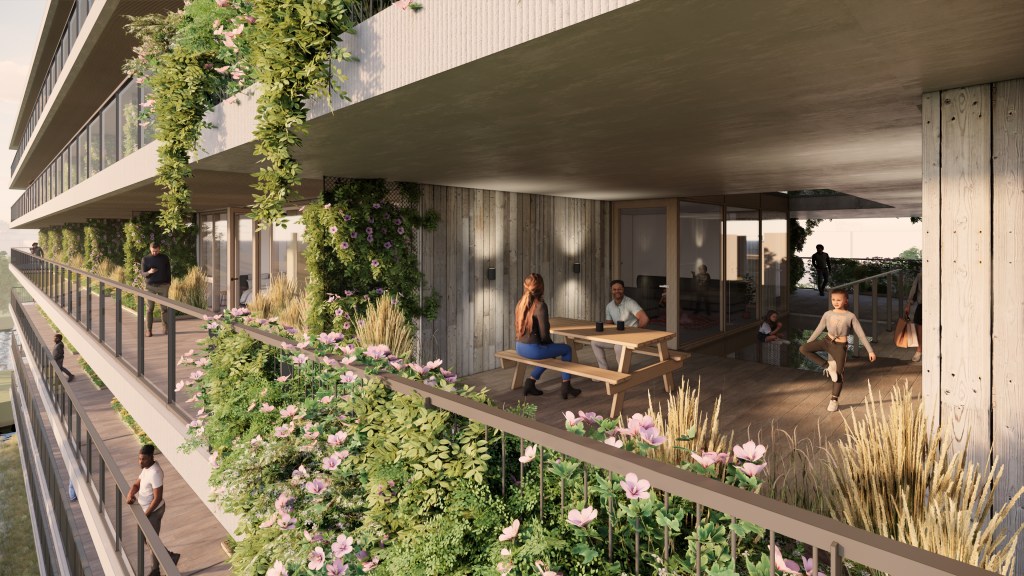 Het gebouw is voorzien van een blauw dak waar het regenwater opgevangen wordt voor de riante balkontuinen voor iedere woning. Met de ruim 6x de wettelijk verplichte waterbuffering is een rainproof gebouw hiermee gegarandeerd. De balkontuinen zorgen voor koeling aan de gevel, biodiversiteit en extra woongenot. Het groen wordt bevloeid via een cascade-systeem. Water wordt opgevangen onder de zonnepanelen op het blauwe dak en stroomt via de gouden regenpijpen naar de holle balkons. Daarin groeit een rijke variatie aan planten, die het hele jaar door bloeien en deels groen blijven in de winter. De groene plantvakken in de balkons zijn eigendom van de vereniging van eigenaren. Het groen is dankzij de watermachine onderhoudsvrij. Geen dure bevloeiïngssystemen maar een intelligente low-tech oplossing. Dankzij de waterbuffering op het dak en de balkons is het project rainproof. Het draagt bij aan de opvang van water bij overvloedige buien en gaat hittestress tegen in warme perioden.