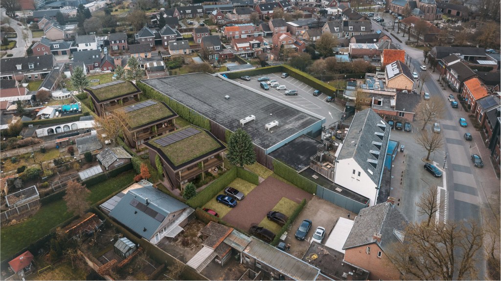 De 3 biobases blokken zijn geplaatst op het binnenterrein midden in het dorp. De twaalf woningen van 50m2 zijn voor starters en ouderen.